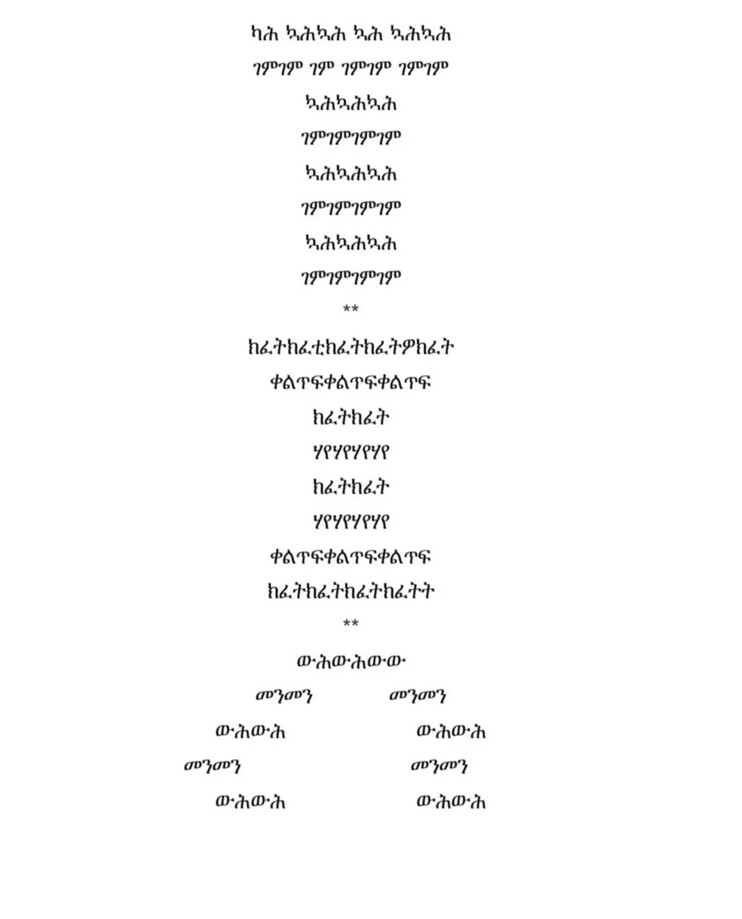 Knock Knockknock knock knockknock Boomboom boom boomboom boomboom Knockknockknock Boomboomboomboom Knockknockknockknock Boomboomboomboom Knockknockknock Boomboomboomboom ** OpenOpenOpenOpen QuickQuickQuick OpenOpen Come on Come on OpenOpen Come on Come on QuickQuickQuick OpenOpenOpenOpen ** Woofwoofwoofwoowoo Who is there? Who is there? Woofwoof Woofwoof Who is there? Who is there?Woofwoof Woofwoof Whoistherewhoisthere? Woofwoof WhoistherewhoisthereWhoisthere? Woofwoof Whoistherewhoistherewhoisthere? Woofwoof Whoistherewhoistherewhoisthere? -From Haile Bizen, Love or Death ((Sweden: Emkulu Publishers, 2019), pp. 122-124.